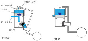 今回の「ダイヤフラム式」は水圧と空気の力を利用して水の止水、給水を行うものになります。