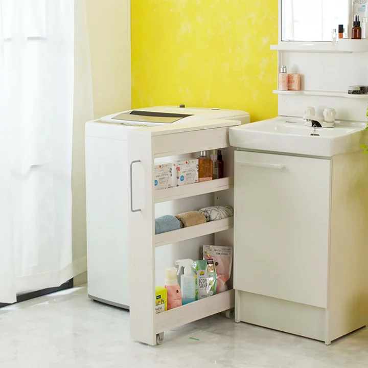 スリムな収納ワゴンを置けば、タオルや洗剤のストック場所に早変わり。