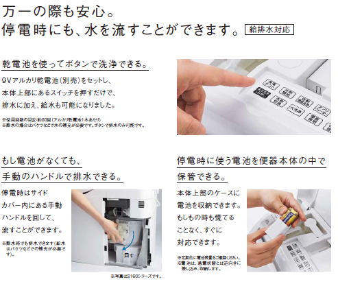 停電時の使用: 停電時は手動で流せない機種もあります。→手動レバー付きの機種も多いです!!