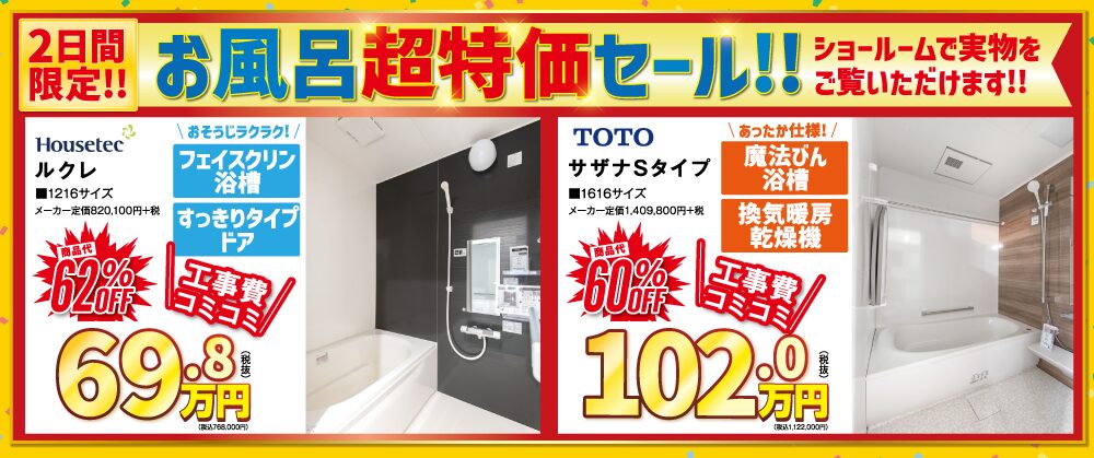 お風呂の人気商品が【工事費コミコミ】のビックリ価格で手に入るチャンス!