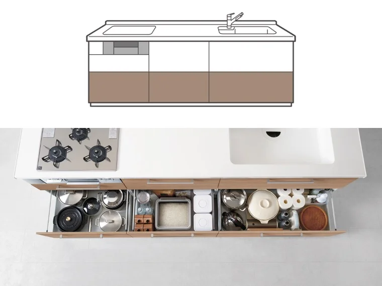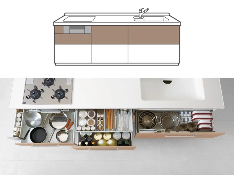 ①収納力の向上: 既存の吊り戸棚に加え、TOTO「ミッテ」の引き出し式収納を多く備えたキャビネットを採用し