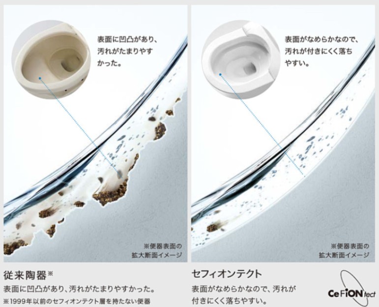 一般的な陶器にある微細な凹凸がないため、汚れが付きにくく、もし付いてもサッと落ちやすいのが特長です。この「セフィオンテクト」と、渦を巻くような「トルネード洗浄」の組み合わせで、少ない水量でも効率的に汚れを洗い流し、キレイが長持ちします。