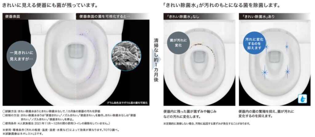 使用前後に便器内に、使用後にはノズル(ウォシュレット)に自動で吹きかけ、見えない汚れや菌を分解・除菌します。トイレの気になる黒ずみや輪じみの発生を抑え、面倒なトイレ掃除の回数をぐっと減らしてくれる、TOTO独自の画期的な機能です。