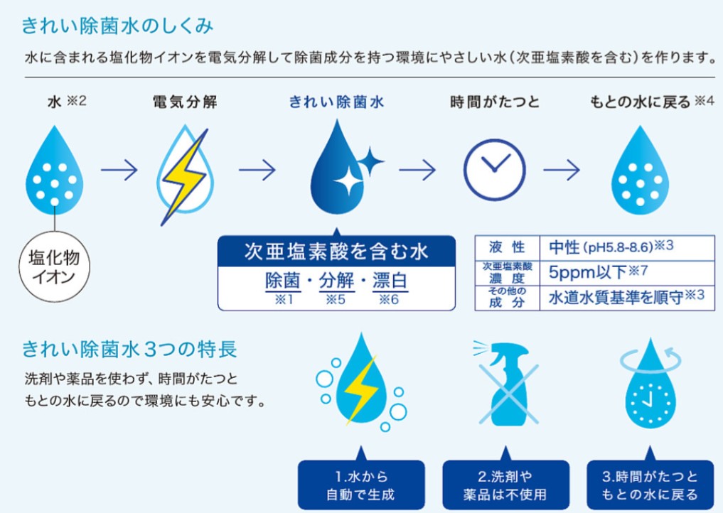 薬品や洗剤を使わず、水道水を電気分解して作られる安全な「きれい除菌水」。